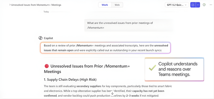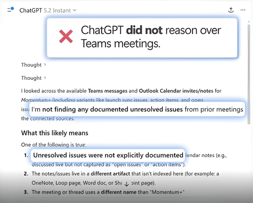 Firstly, in Microsoft Team meetings, Microsoft 365 Copilot is able to understand and reason over conversations both during and after every meeting. It automatically captures key decisions, tracks action items, and ensures nothing is missed, This making follow-ups seamless for users. In contract, ChatGPT is not natively integrated into meetings and therefore cannot independently capture or reason over and surface action items from live discussions.
