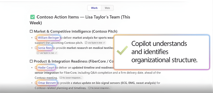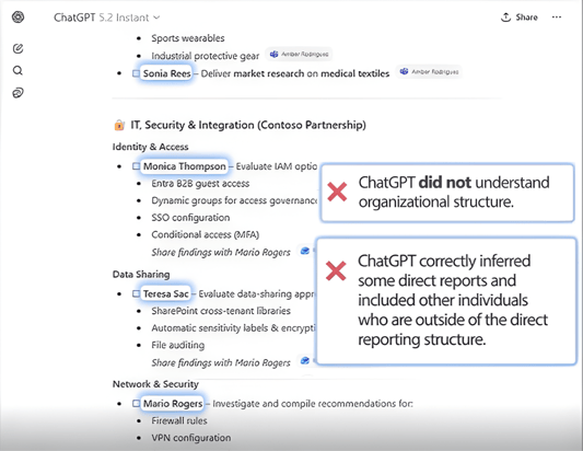 Secondly, Copilot has a strong understanding of organisational structure. Copilot is able to recognise how teams are connected, who reports to whom, and uses this context to generate highly relevant and personalised responses. ChatGPT, on the other hand, may sometimes misinterpret reporting lines or include unrelated individuals, as it lacks direct awareness of organisational hierarchies.