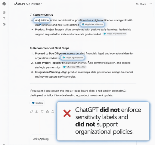 Next, sensitivity labels are a key differentiator. Copilot respects and enforces Microsoft 365's built-in security framework, ensuring that sensitive data are kept well protected and safe. It is able to differentiate which documents are accessible and which are restricted, preventing accidental oversharing of confidential information. ChatGPT on the other hand, does not inherently enforces these entreprise sensitivity labels in the same way, which may lead to potential gaps in aligning with organisational data governance policies.
