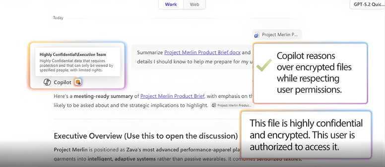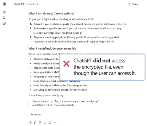 When it comes to encrypted files, Copilot can recognise when a document is highly confidential and is able to verify whether the user has the appropriate permissions before generating insights or summaries. This ensures compliance with access controls while still delivering value. In comparison, ChatGPT's ability to process attached files depends on how the content is provided, and it may not always deliver the same level of seamless, permission-aware summarisations.