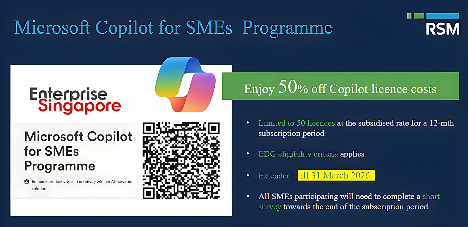 The Microsoft Copilot for SMEs Programme in Singapore, supported by Enterprise Singapore, offers eligible small and medium-sized enterprises (SMEs) a 50% subsidy on Microsoft 365 Copilot licenses for a 12-month subscription. The program supports up to 50 licenses per SME to improve productivity using AI. Applications are open until 31 March 2026.